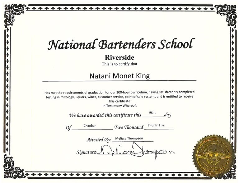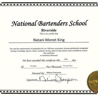 Greetings and welcome to BevBabe. I'm Natani King, active mobile bartender and certified mixologist. A San Diego native, I relocated to the Inland Empire and received my bachelors at the University of California, Riverside with the class of 2024. Currently, I am pursuing my masters degree with aspirations of establishing a career in mental health care. My aim is providing an elaborate, energetic, and exceptional mobile bartending experience to all gatherings, cheers to more life.